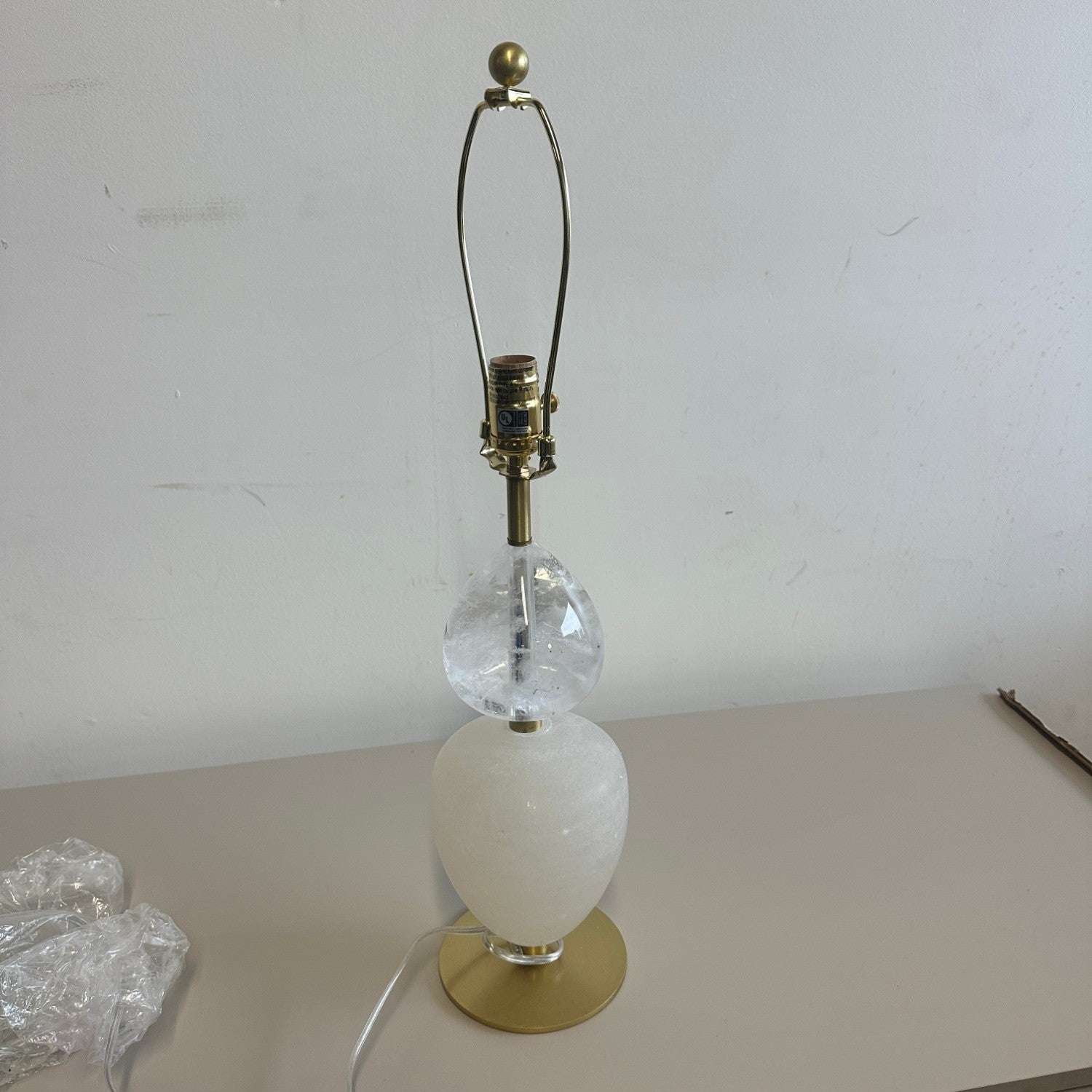 This Arteriors Home Aubrey lamp is a customer return and in great condition overall. It features the signature mix of marble/crystal orbs and an antique brass base that Arteriors is known for. The only flaw is a few small black dots on the lamp body (see pictures). It’s missing the shade, but replacement shades are easy to find in any lighting or home décor store. Only one available.