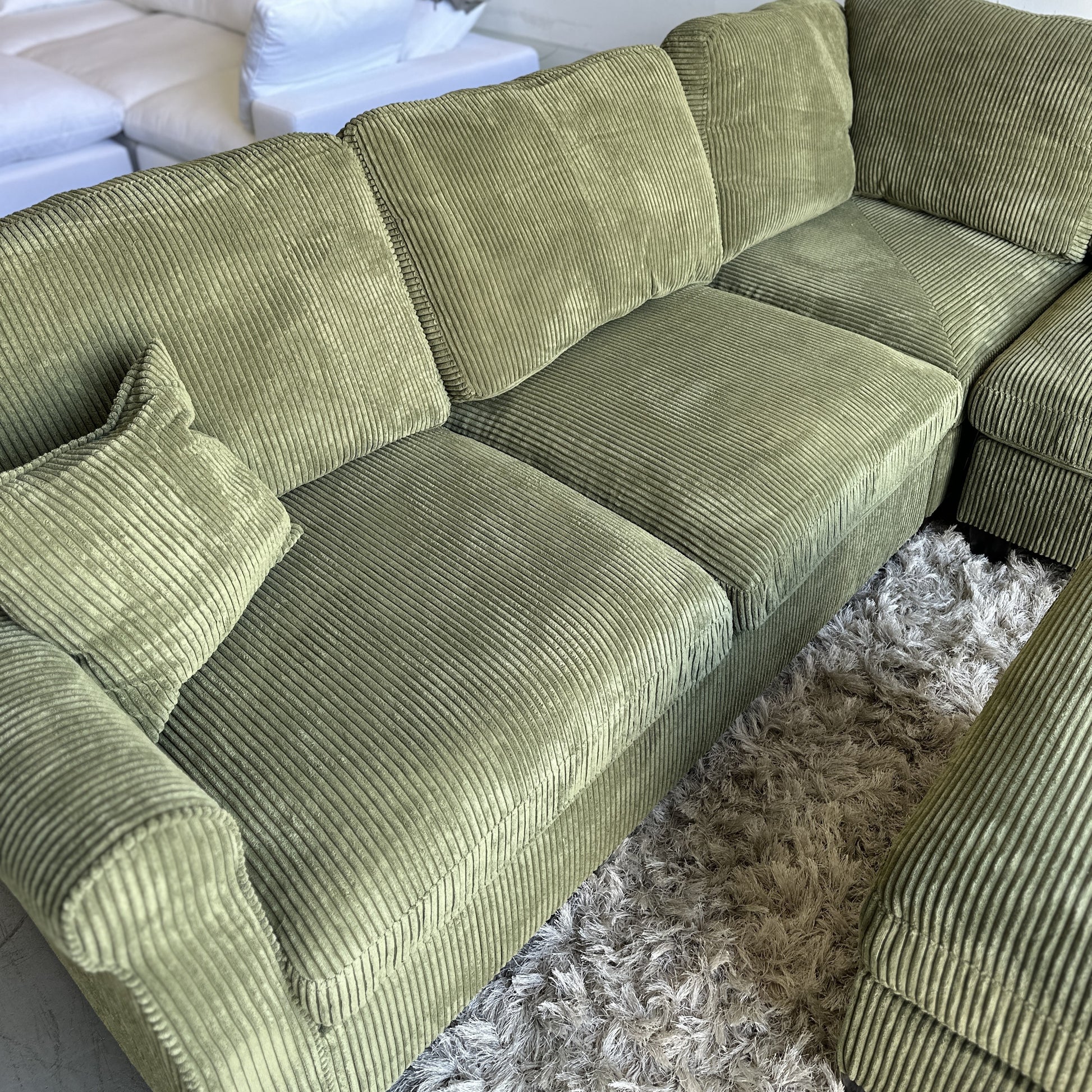 This plush sectional is the perfect gathering spot for friends and family. Its modern, low-profile design is accented by barely visible legs, giving it a sleek look. Wrapped in a super soft corduroy, this sectional is an inviting and comfortable addition to any living space. The removable cushion covers make cleaning a breeze, so you don't have to worry about spills.