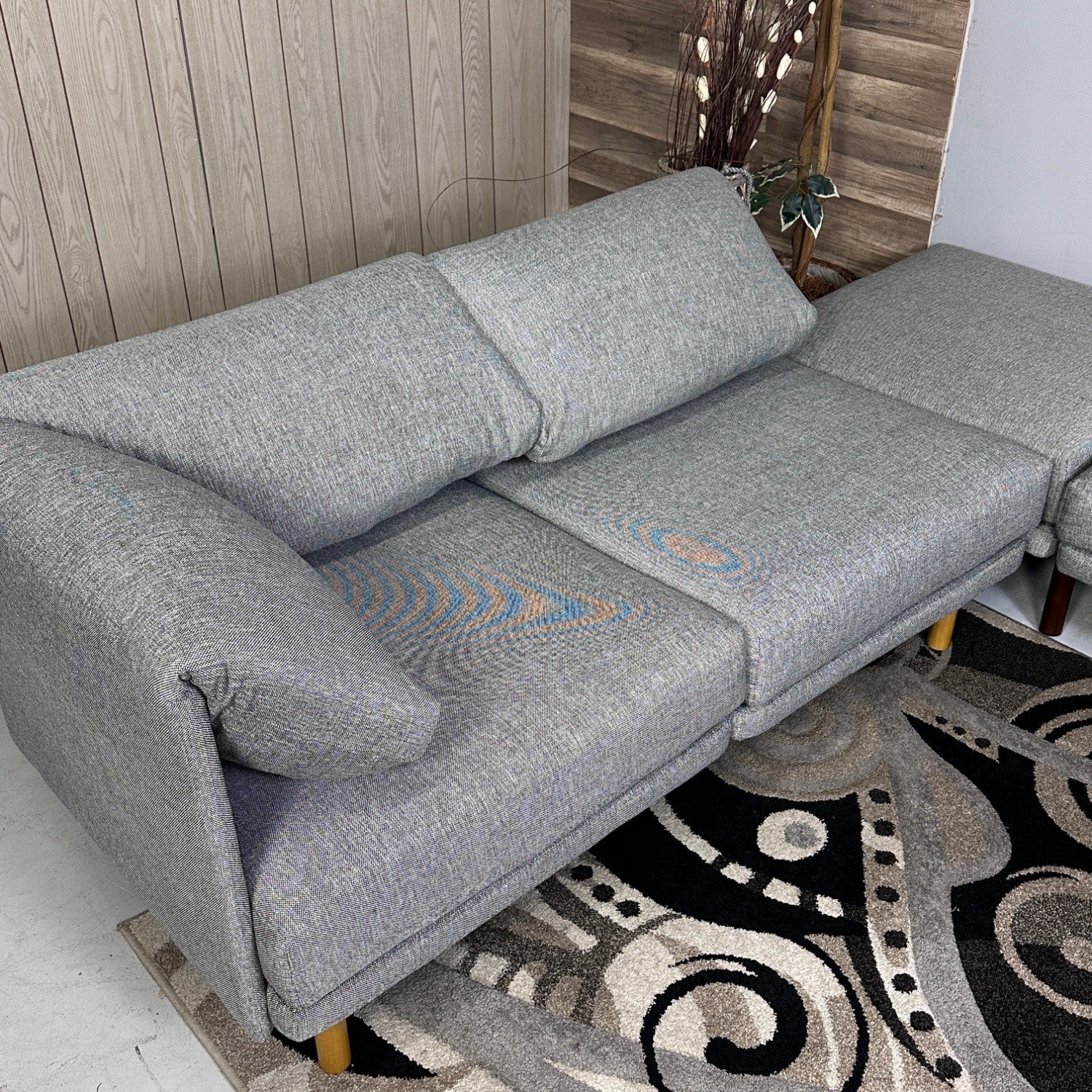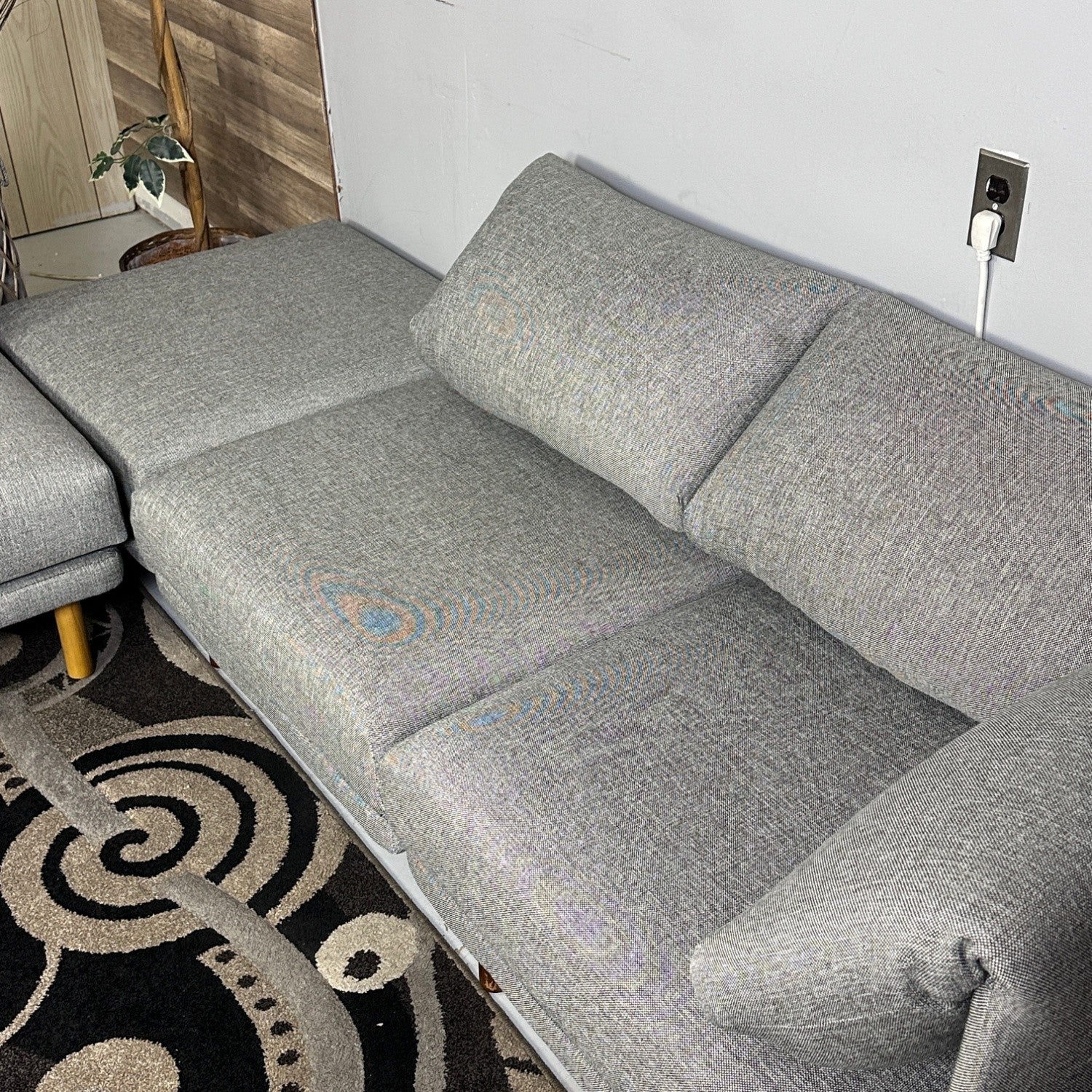 This Burrow Range 5-piece sectional is a mix of two customer-return seats and 3 preowned seats. Upholstered in Burrow’s Storm Grey fabric, which is durable and easy to clean. The Range collection is fully modular, so even though it’s shown in an L-shape in the photos, each piece can be rearranged to fit your space or expanded with more Burrow modules in the future. This configuration is not on the website but its the only configuration I found that works with the seats I have. Legs are a mix of light and dark brown. Seats are supportive with a modern low-profile look, and everything connects securely.