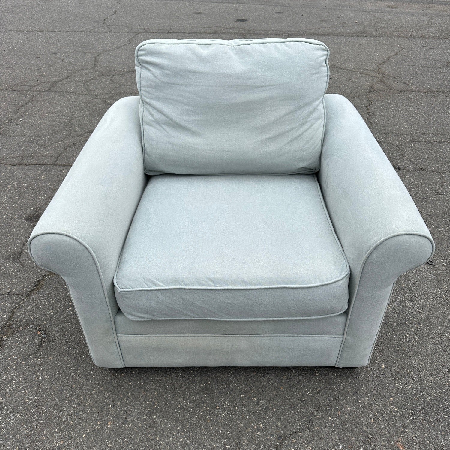 This preowned curved sectional is in good condition with some visible signs of wear and tear from regular use. The back cushions are attached, and the bottom cushions can be removed and washed. Fabric is a soft blue-grey tone, and it includes a matching chair.