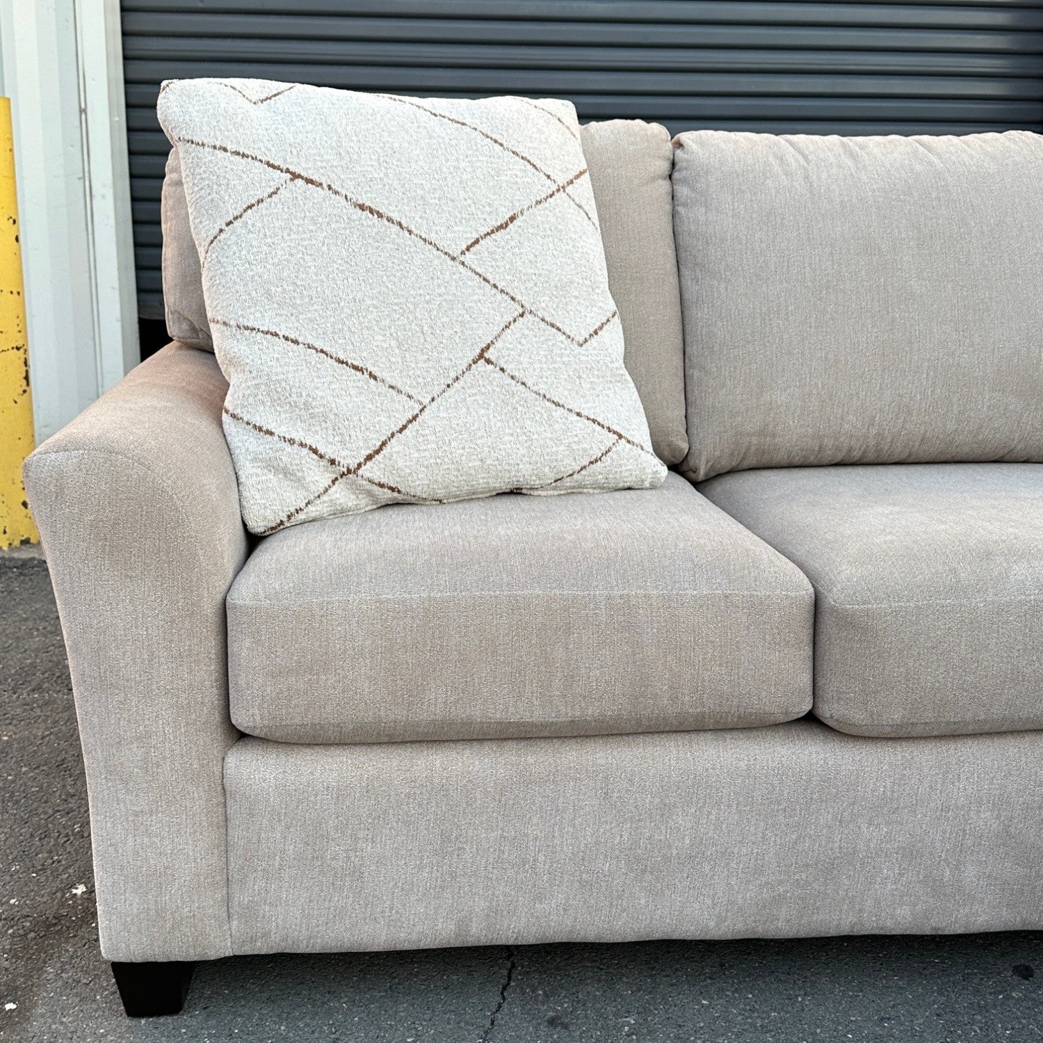 This grey L-shaped sectional is used but in great condition. It features a pull-out bed. The back cushions are attached, and the bottom cushions are removable and washable for easy cleaning. The cushions still have that brand-new firmness and support, showing minimal wear. There are a few small knicks on the back from moving, but nothing major or noticeable. A solid, comfortable piece with tons of functionality and life left in it.