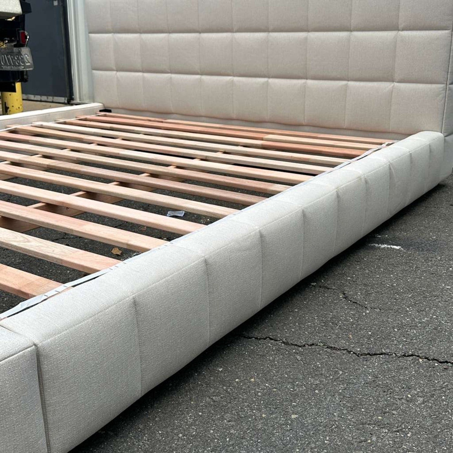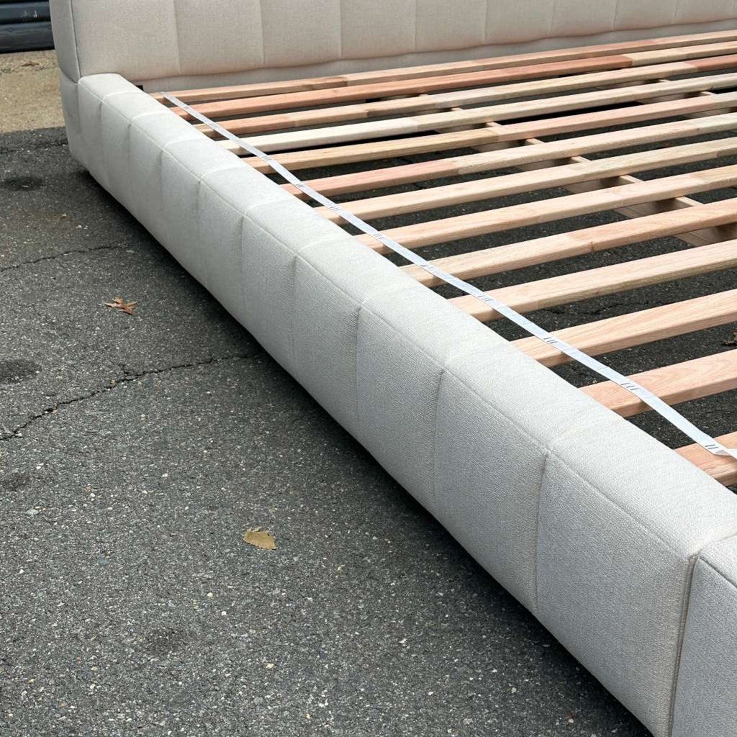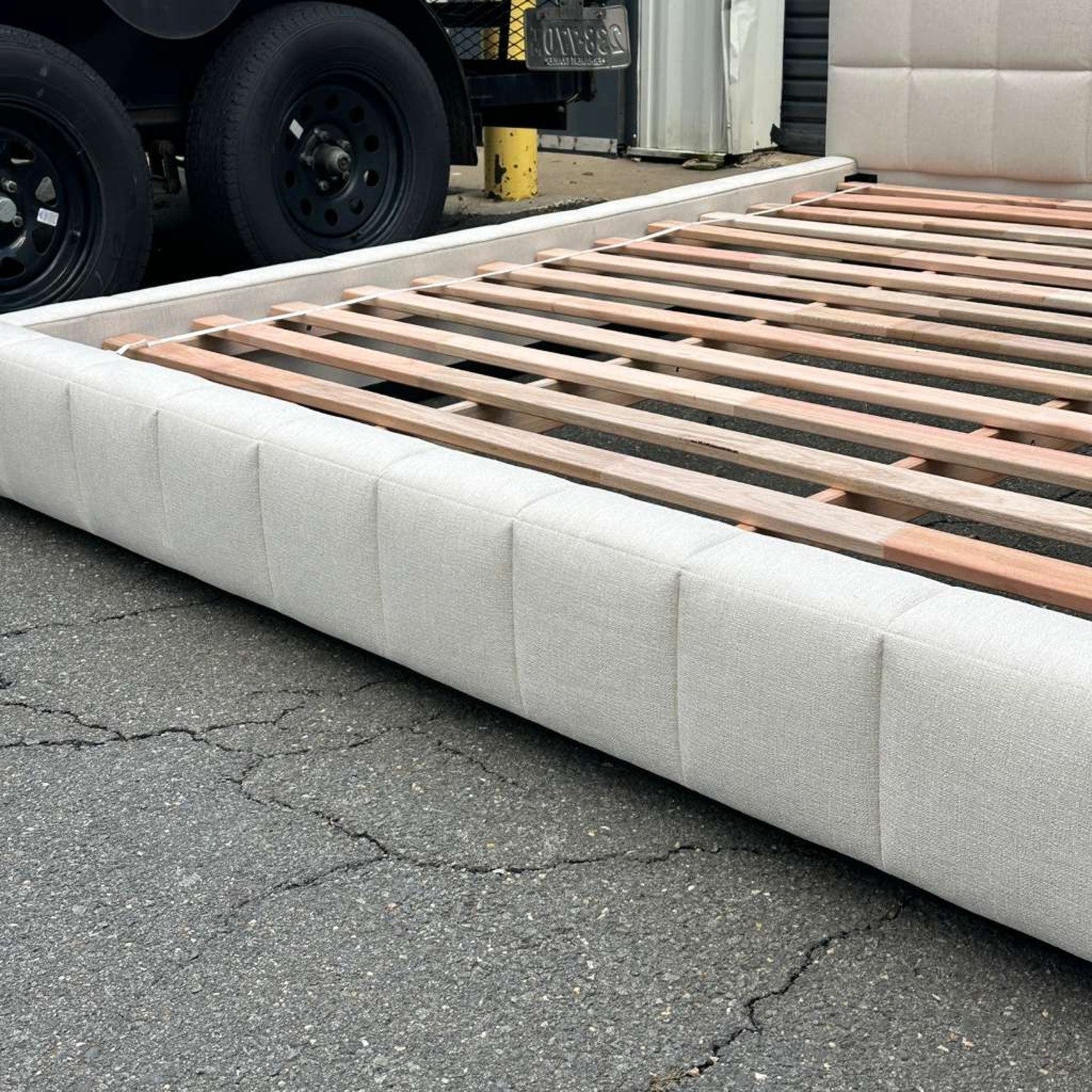 This is a King-sized Thompson Bed, basically brand new — it was a customer return and hasn’t really been slept in. Upholstered in fabric with square-tufted detailing, solid pine-slat platform base (no box spring needed), low-profile and modern look. Great condition and ready to go.